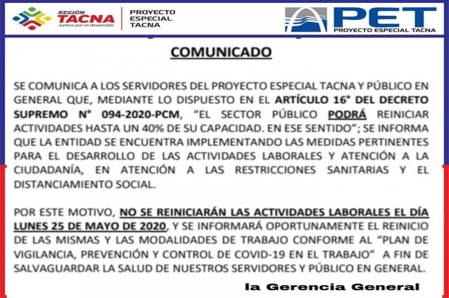 Se comunica a los servidores del Proyecto Especial Tacna y público en general que, mediante lo dispuesto en el artículo 16° del Decreto Supremo Nro. 094-2020-PCM, "El sector público podrá reiniciar actividades hasta un 40% de su capacidad". En ese sentido; Se informa que la entidad se encuentra implementando las medidas pertinentes para el desarrollo de las actividades laborales y atención a la ciudadanía, en atención a las restricciones sanitarias y el distanciamiento social.