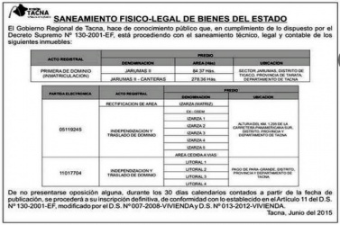 El Gobierno Regional de Tacna esta procediendo con el saneamiento técnico, legal y contable de los inmuebles que se detallan en el Cuadro.