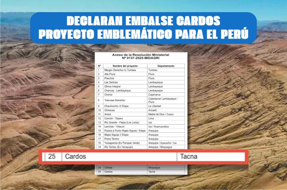 ¡Buena noticia para Tacna!. El Ministerio de Desarrollo Agrario y Riego (MIDAGRI) aprobó, mediante la Resolución Ministerial N° 0137-2025-MIDAGRI, publicada el 25 de abril de 2025 en el diario oficial El Peruano, la declaratoria del Proyecto Embalse Cardos como proyecto emblemático de interés estratégico para el desarrollo de la región Tacna.
