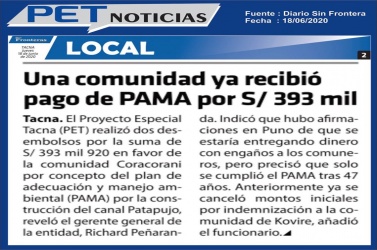 por la suma de 393 mil 920 soles a la comunidad de Coracorani.