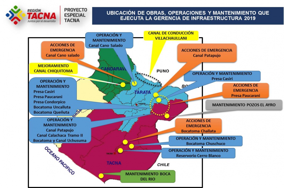 Tacna, Mayo 2019.- La Gerencia de Infraestructura es el órgano de línea encargado de programar, ejecutar, controlar, supervisar y evaluar la correcta ejecución de las obras de infraestructura del Proyecto Especial Tacna (PET), haciendo cumplir las exigencias técnicas, financieras y administrativas de los expedientes técnicos, propios de los procesos de licitaciones y concursos públicos, ejecución de las obras bajo las diferentes modalidades que permite la ley y de la supervisión de las mismas.